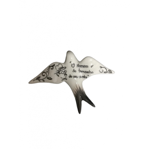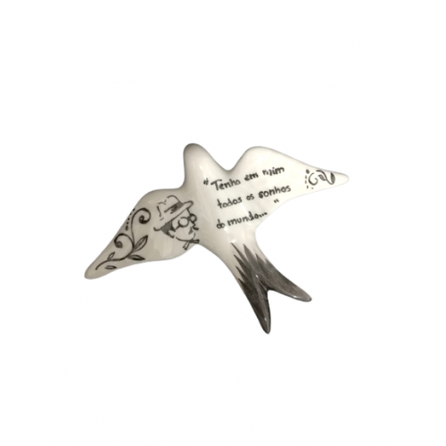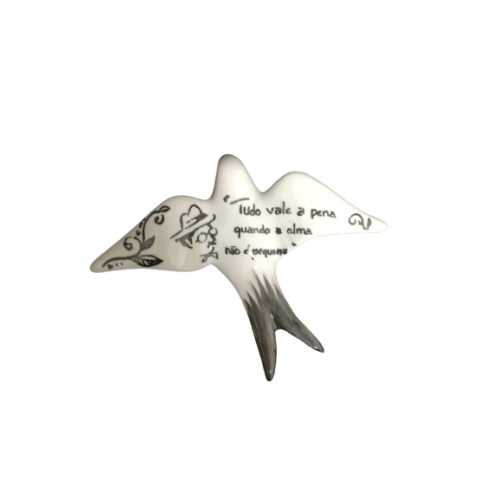 Andorinha pequena decorada totalmente à mão com citações de Fernando Pessoa.