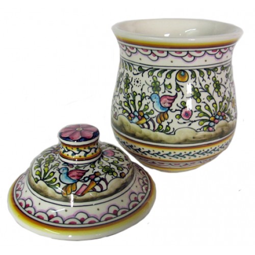 Bomboneira redonda baixa decorada totalmente à mão com a pintura de Coimbra, século XV Dimensões..