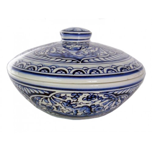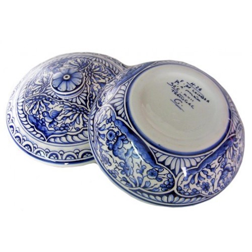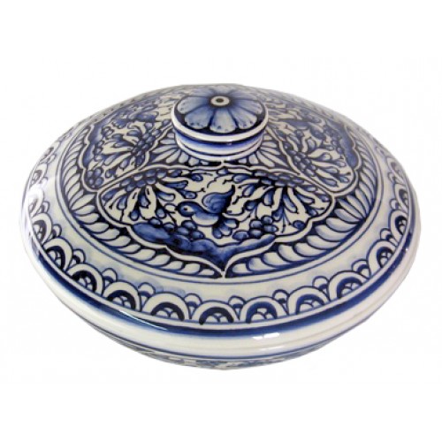 Bomboneira redonda baixa decorada totalmente à mão com a pintura de Coimbra, século XVII a azul cobalto