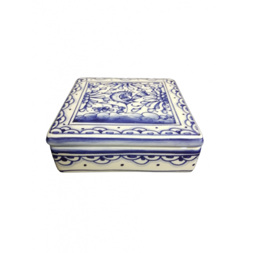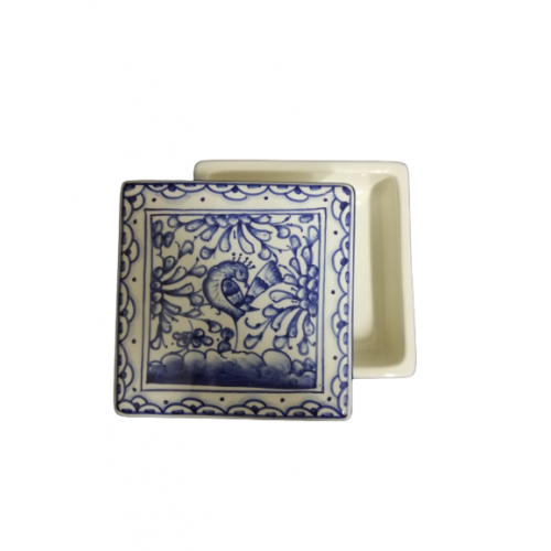 Caixa de joias quadrada decorada totalmente à mão com a pintura de Coimbra, século XVII a azul D..
