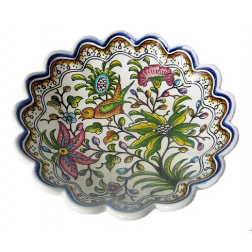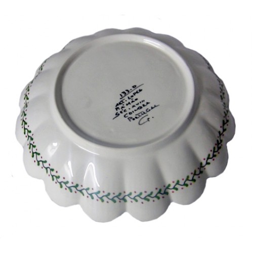 Saladeira ou taça redonda ondulada decorada totalmente à mão com a pintura de Coimbra, século XVIII ..
