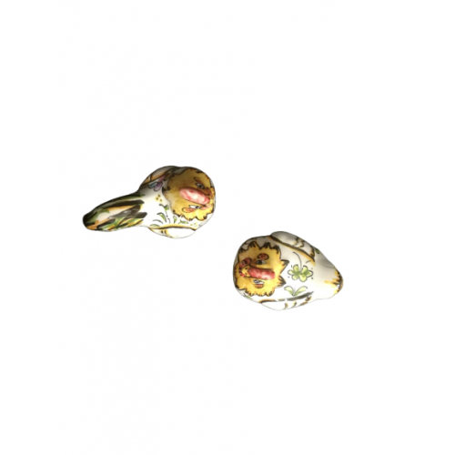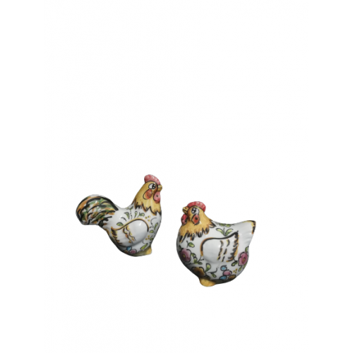 Pimenteiro galinha composto por um galo e uma galinha decorados totalmente à mão com a pintura de Coimbra, século XVII a cores.