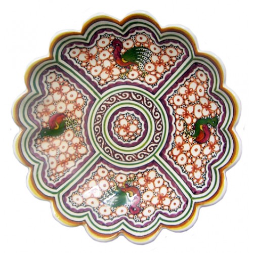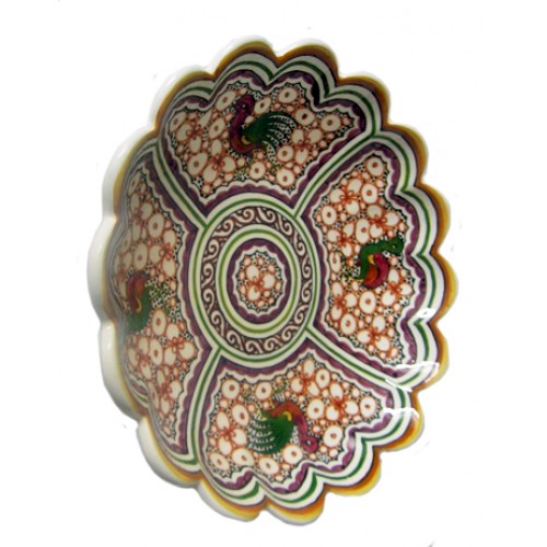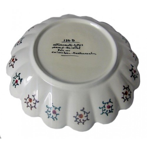 Saladeira ou taça redonda ondulada decorada totalmente à mão com a pintura de Coimbra, século XV predominando os tons castanhos e verdes.