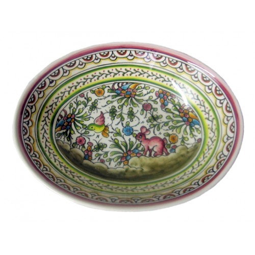 Taça ou saladeira oval decorada totalmente à mão com a decoração de pintura de Coimbra, século XVII a cores.
